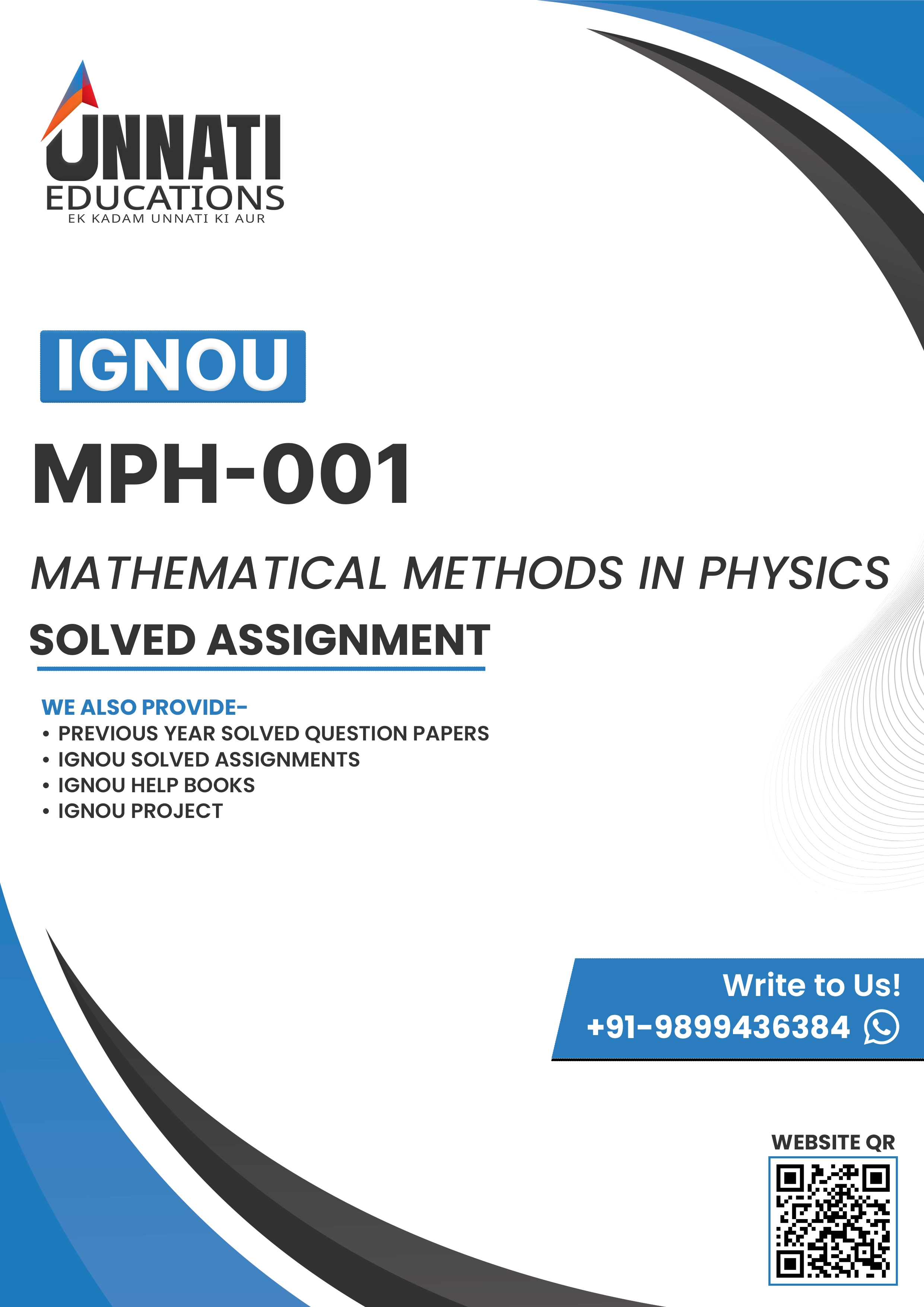MPH 001 Solved Assignment 2025-26 for IGNOU M.Sc. Physics students. MPH 001 Mathematical Methods In Physics is designed to strengthen your foundation in advanced mathematical tools used in theoretical physics. This course covers partial differential equations, Laplace equation, Bessel and Hermite polynomials, matrices, tensors, complex analysis, contour integration, Laurent series, Fourier transforms and group theory concepts. Our solved assignment is written in clear academic language, stepwise derivations, proper formatting and complete working to help you score confidently as per IGNOU guidelines.