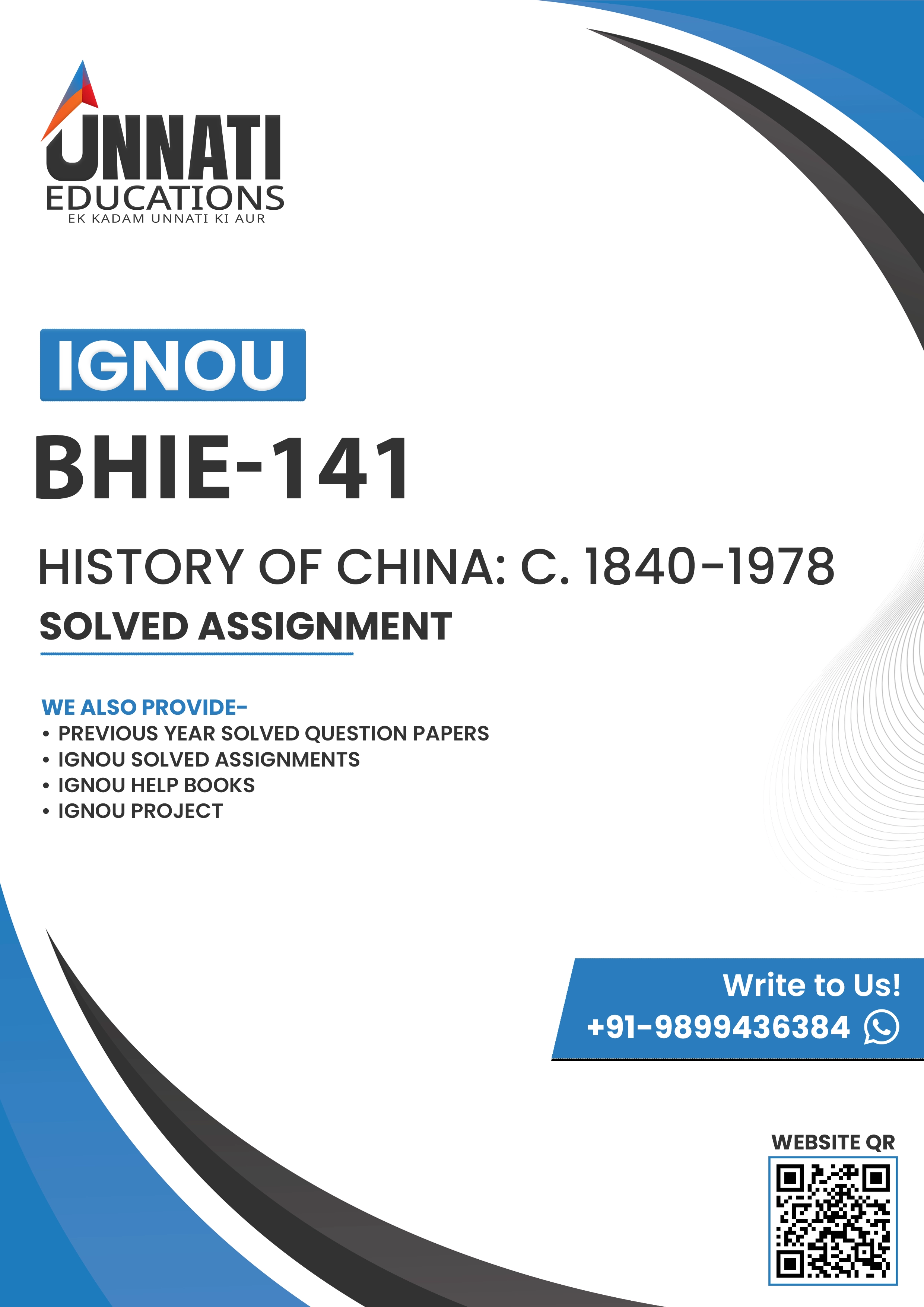 BHIE 141 History of China: C. 1840-1978 Solved Assignment is specially prepared for IGNOU students of July 2025 and January 2026 session. This course takes you through major political, social and economic changes in China from the Opium Wars to the Communist Revolution and beyond. It covers Taiping Rebellion, Self-Strengthening Movement, Qing reforms, rise of nationalism, 1911 Revolution, May Fourth Movement, Chinese Communist Party, Sun Yat-sen and the formation of modern China. Our solutions are written in simple academic language, structured properly, and strictly follow IGNOU word limits and marking scheme.